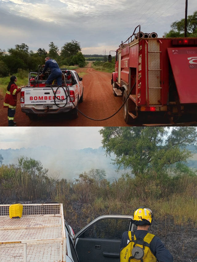 Este 13 de febrero de 2026, a las 17:50 horas, se recibieron denuncias por dos incendios de maleza en distintos sectores de la ciudad de Apóstoles. Uno de los focos se registró en el barrio Estación y el otro en el barrio 200 Viviendas, lo que motivó el despliegue inmediato de dotaciones de Bomberos Voluntarios.