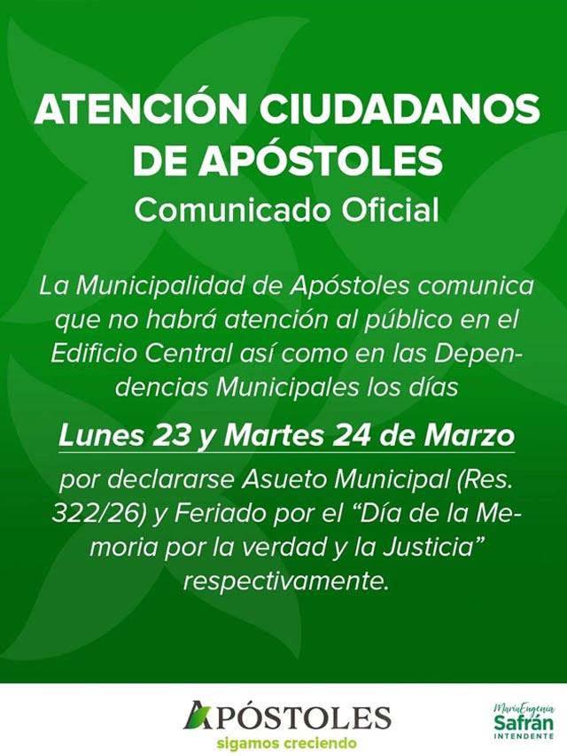 AGENCIA MISIONES.UNO | La Municipalidad de Apóstoles comunicó que no habrá atención al público en el edificio central ni en las distintas dependencias municipales durante los días lunes 23 y martes 24 de marzo, en el marco de un asueto municipal y un feriado nacional.