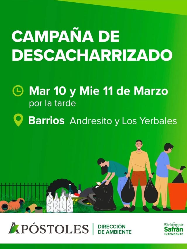 AGENCIA MISIONES.UNO | La Dirección de Ambiente de Apóstoles informó que se llevarán adelante nuevas jornadas de descacharrizado en distintos sectores de la ciudad, con el objetivo de prevenir la proliferación del mosquito transmisor del dengue y promover la limpieza en los barrios.